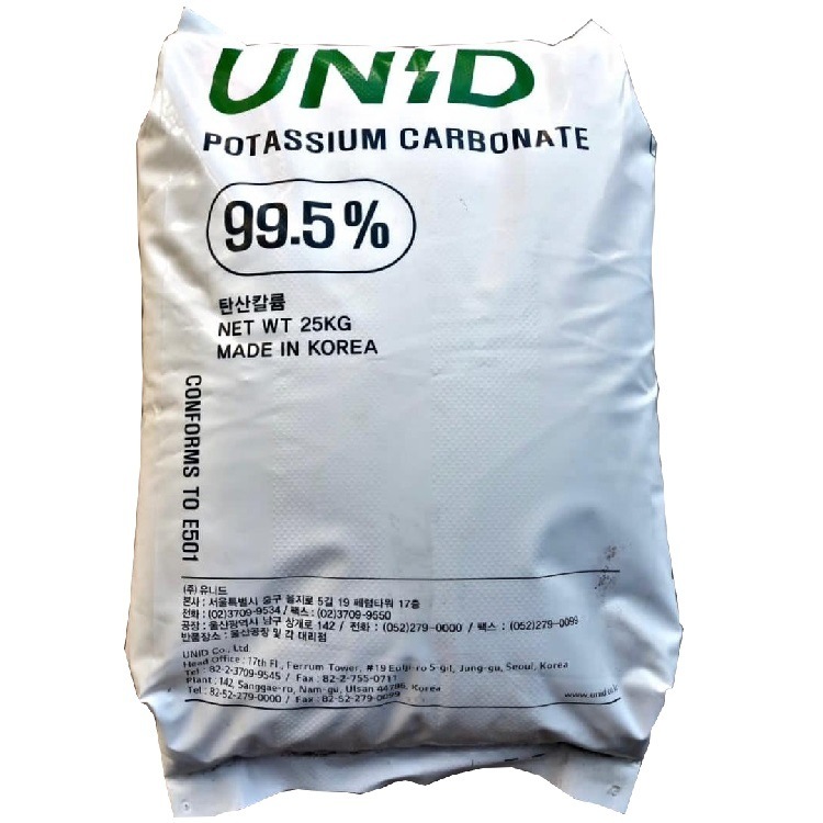 Potassium carbonate exhibits strong hygroscopic properties. When exposed to air, it absorbs carbon dioxide and water, converting to potassium bicarbonate. Proper packaging must be sealed to maintain product integrity.